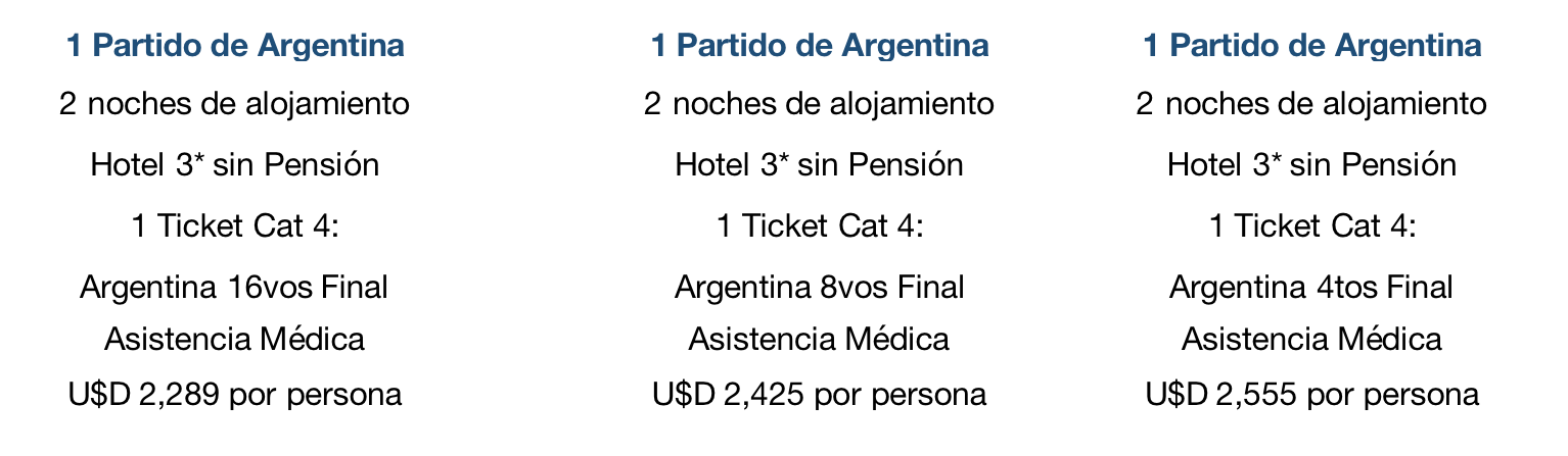 U$D 100.- por persona para los paquetes de 2 y 3 partidos (No acumulable con otras promociones o descuentos)